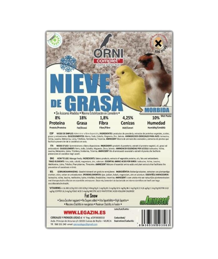 La Nieve de Grasa LEGAZIN es un alimento complementario de alta calidad, especialmente formulado para aportar energía extra y excelente palatabilidad a las aves ornamentales. Su textura mórbida, su máxima estabilidad en comedero y su fórmula sin azúcares añadidos la convierten en un producto ideal para el uso diario y para momentos de mayor desgaste físico.